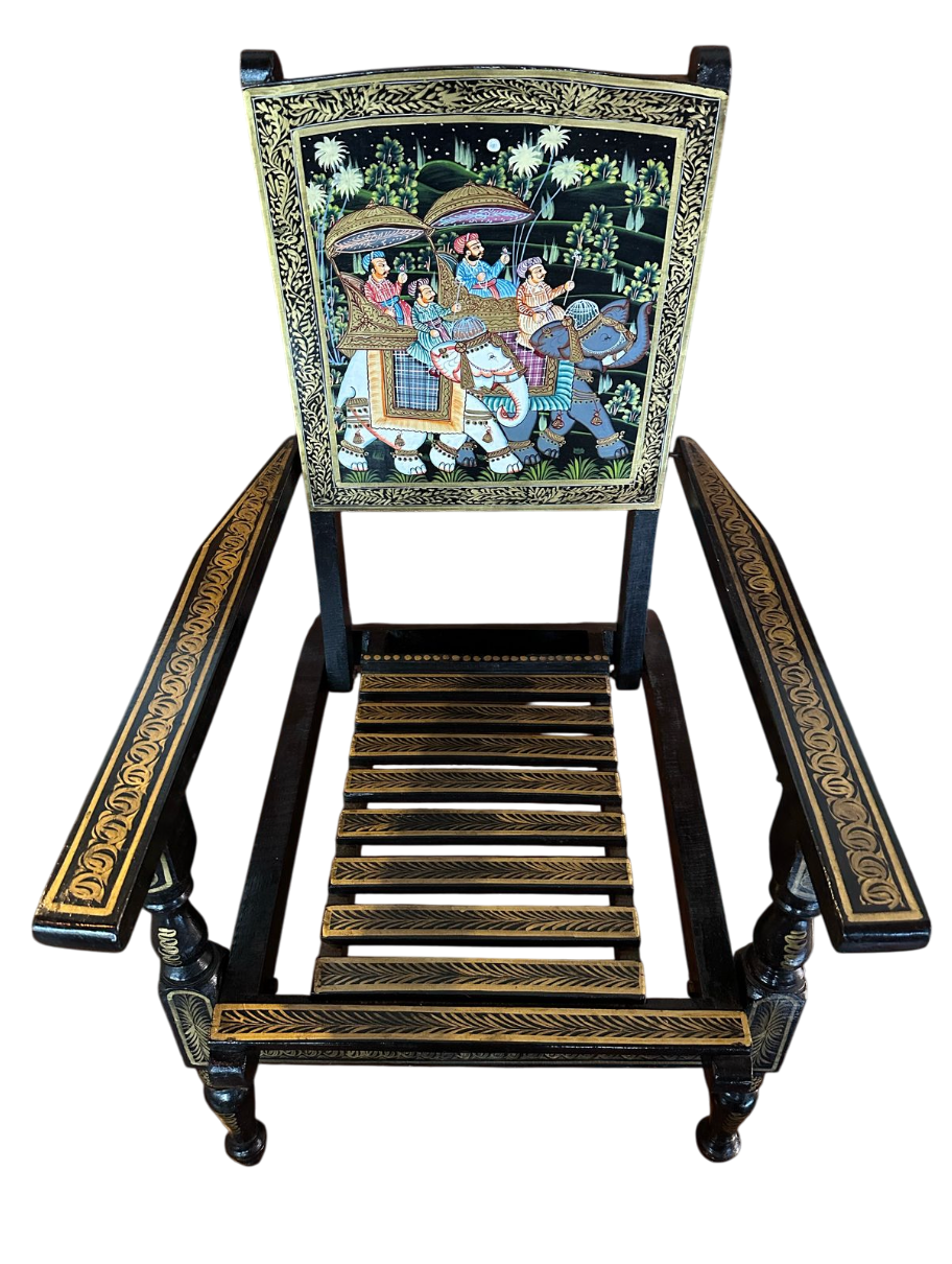 A poltrona de madeira indiana pintada com figuras da Índia é uma obra de arte que combina habilidades artesanais tradicionais com elementos culturais ricos. É decorado com pinturas à mão que retratam diversas cenas e temas indianos. As cores usadas nas pinturas são vibrantes e significativas na cultura indiana, como o vermelho simbolizando a paixão e o poder, o azul representando a divindade e a espiritualidade, o verde denotando a natureza e a fertilidade, e o dourado simbolizando a prosperidade e a riqueza. Essa poltrona não apenas serve como impressionante peça decorativa, mas também conta histórias e tradições antigas da Índia, adicionando uma dimensão cultural significativa ao ambiente onde é exibido.