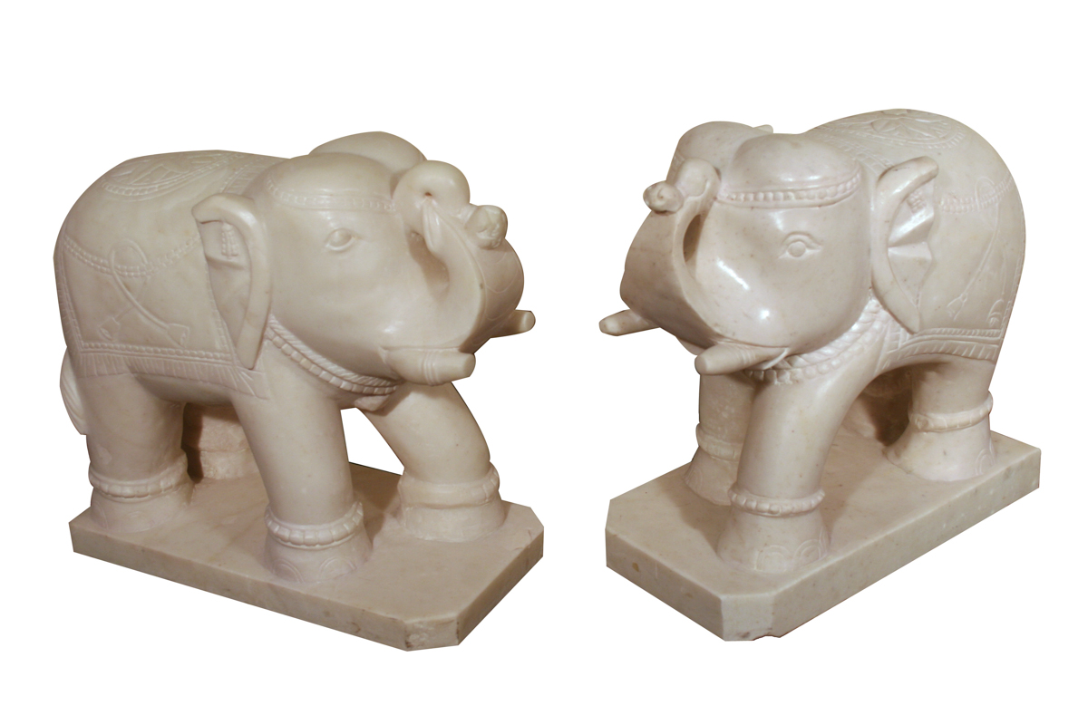 Dois elefantes de mármore branco para decoração são peças elegantes e imponentes. Com sua textura suave e brilho natural, o mármore branco realça a forma majestosa do elefante, destacando suas características como as presas curvadas e as orelhas grandes. Estas peças são uma adição sofisticada a qualquer ambiente, adicionando um toque de luxo e elegância à decoração.
