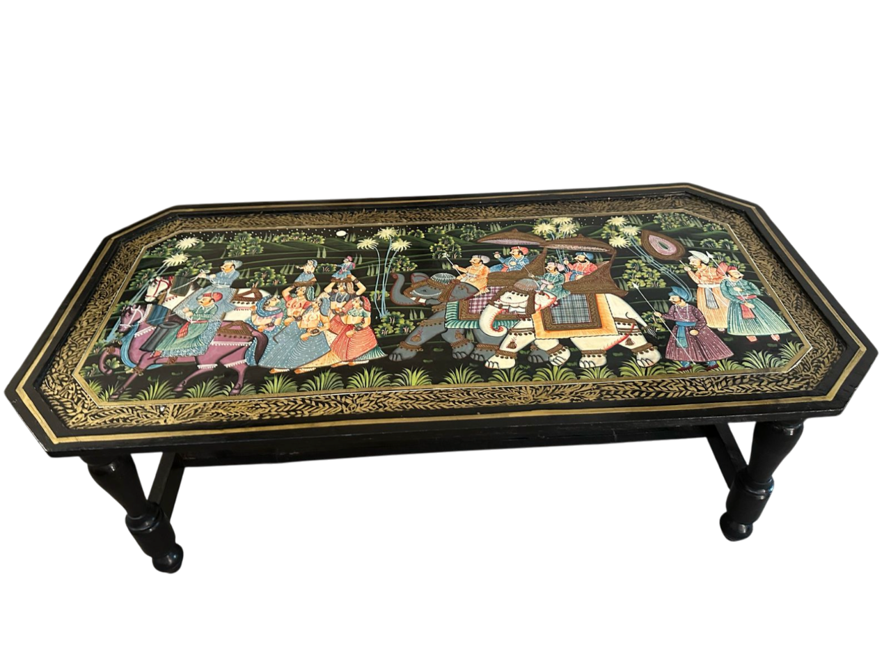 A mesa de madeira indiana pintada com figuras da Índia é uma obra de arte que combina habilidades artesanais tradicionais com elementos culturais ricos. É decorado com pinturas à mão que retratam diversas cenas e temas indianos. As cores usadas nas pinturas são vibrantes e significativas na cultura indiana, como o vermelho simbolizando a paixão e o poder, o azul representando a divindade e a espiritualidade, o verde denotando a natureza e a fertilidade, e o dourado simbolizando a prosperidade e a riqueza. Essa mesa não apenas serve como impressionante peça decorativa, mas também conta histórias e tradições antigas da Índia, adicionando uma dimensão cultural significativa ao ambiente onde é exibido.